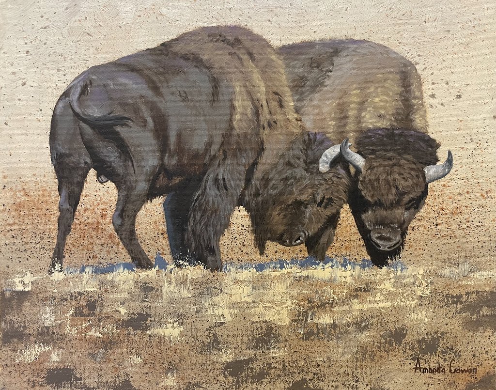 Western and wildlife artist, Amanda Cowan, has been expressing herself through art for as long as she can remember. She spent most of her time outdoors drawing the horses, cows and any wildlife that she came across when she was a young girl. Cowan is a self–taught artist. She paints in watercolors and oils. Her art is in private collections in Korea, Australia, Canada, France and the United States. She lives with her husband on a ranch in southwest Wyoming, where she rides horses behind cattle all year long and feeds them with a team in the winter. She never runs out of amazing inspiration.
