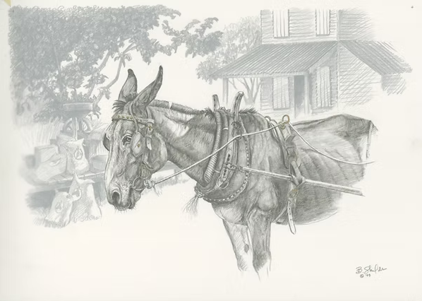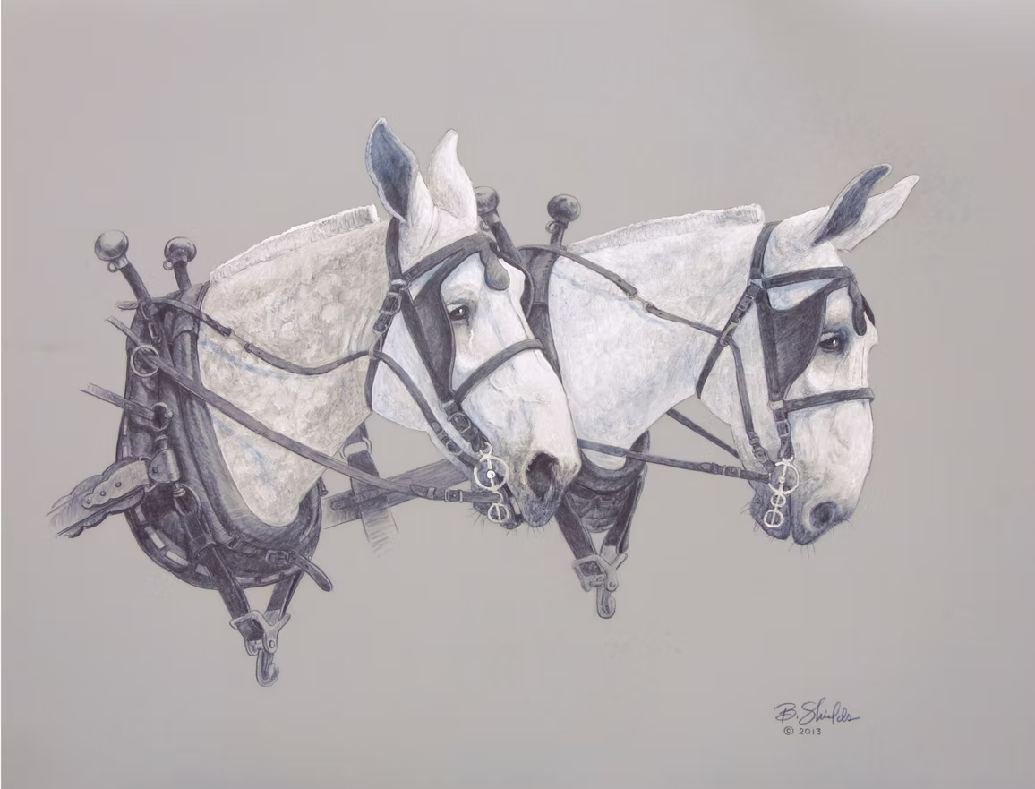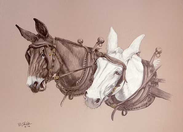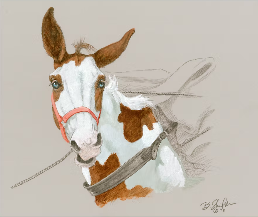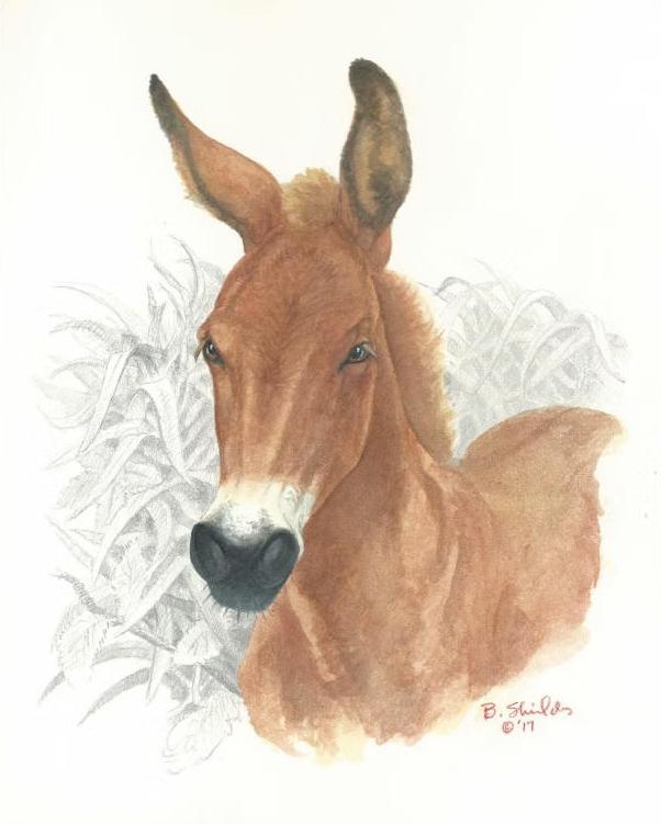 Bonnie Shields is a well-known American Western artist known as, “The Tennessee Mule Artist.” She is especially famous for her detailed, humorous, and affectionate artwork focused on mules and donkeys. Her work stands out because it captures the personality and intelligence of mules, sometimes with narrative flair, sometimes with a cartoon-like twist.