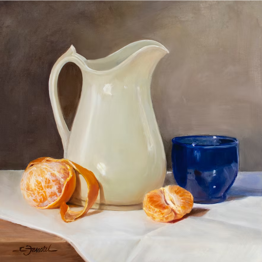 Cynthia Feustel is an oil painter primarily known for her portrait and figurative work. Whether capturing an introspective moment of a figure or the quiet stillness in an arrangement of treasured objects, the subjects in her paintings are sensitively rendered inviting viewers into the narratives she portrays. Having been a traditional portrait artist for 25 years, her attention to detail is evident. Adhering to the time-honored method of building up multiple layers of paint over an initial underpainting, her work merges the classical tradition of oil painting with images that reveal a fresh, contemporary expression.