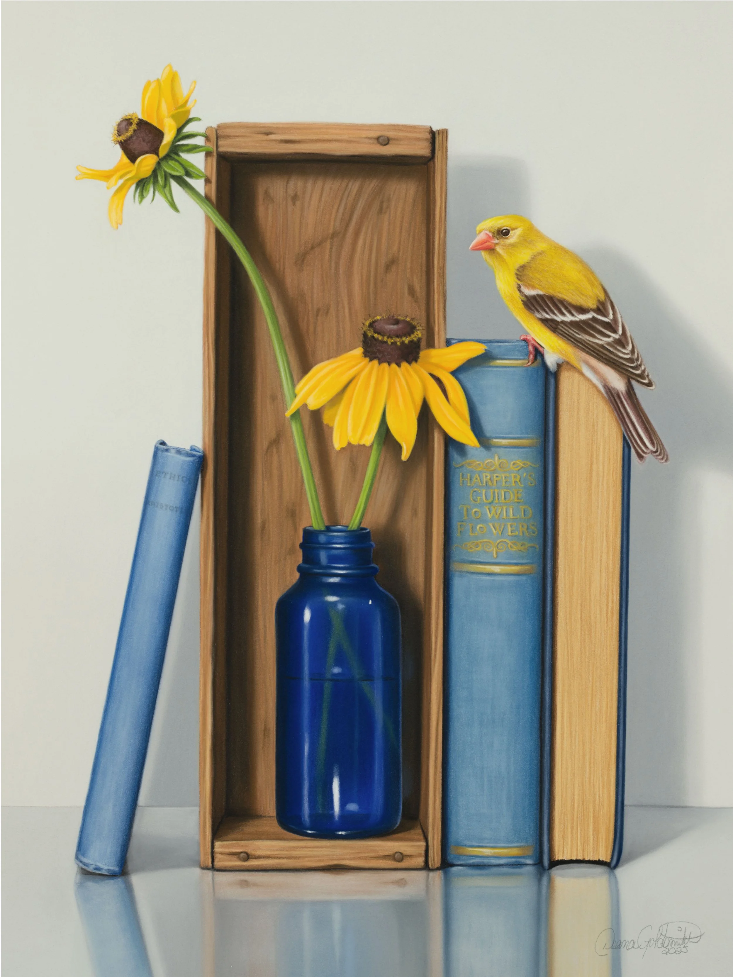 Deana Goldsmith is an American pastel artist known for her richly detailed still life and bird pastel drawings that often evoke a sense of nostalgia and connection with nature. She is a self-taught artist. Her carefully composed scenes feature birds, vintage objects, and flora, created with pan pastels, pastel pencils and sticks on sanded pastel paper. She builds many delicate layers to achieve her soft, yet detailed, compositions.