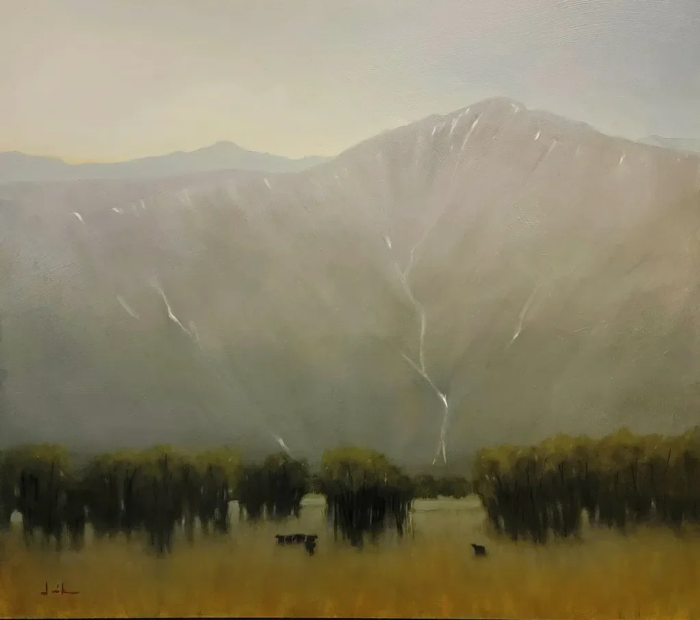 Kay Juricek paints landscapes of the American West, with a particular fascination for areas in Colorado like the San Luis Valley and North Park. Her oil paintings highlight the open, expansive beauty of these regions — vast vistas, light-filled skies, and scenes that inspire a sense of peace and spiritual connection to the land. She strives to capture both the transcendent beauty and the emotional essence of these places. Her artistic voice reflects her personal experience, treating scenic views with a blend of realism and emotional depth inspired by the memory of her experience with the site.