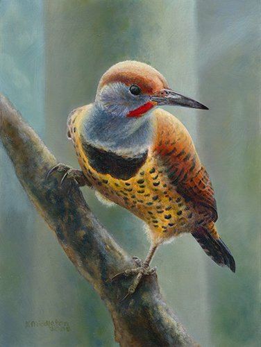 Kim Middleton is an oil painter who specializes in avian art using renaissance era glazing techniques. This time–honored technique of layering transparent glazes with opaque layers achieves rich luminosity as light penetrates and reflects through the layers of oil paint. This method creates a sense of volume and showcases the resplendent beauty of the colors and feather patterns found among birds.