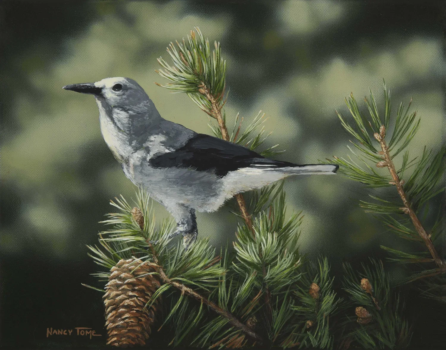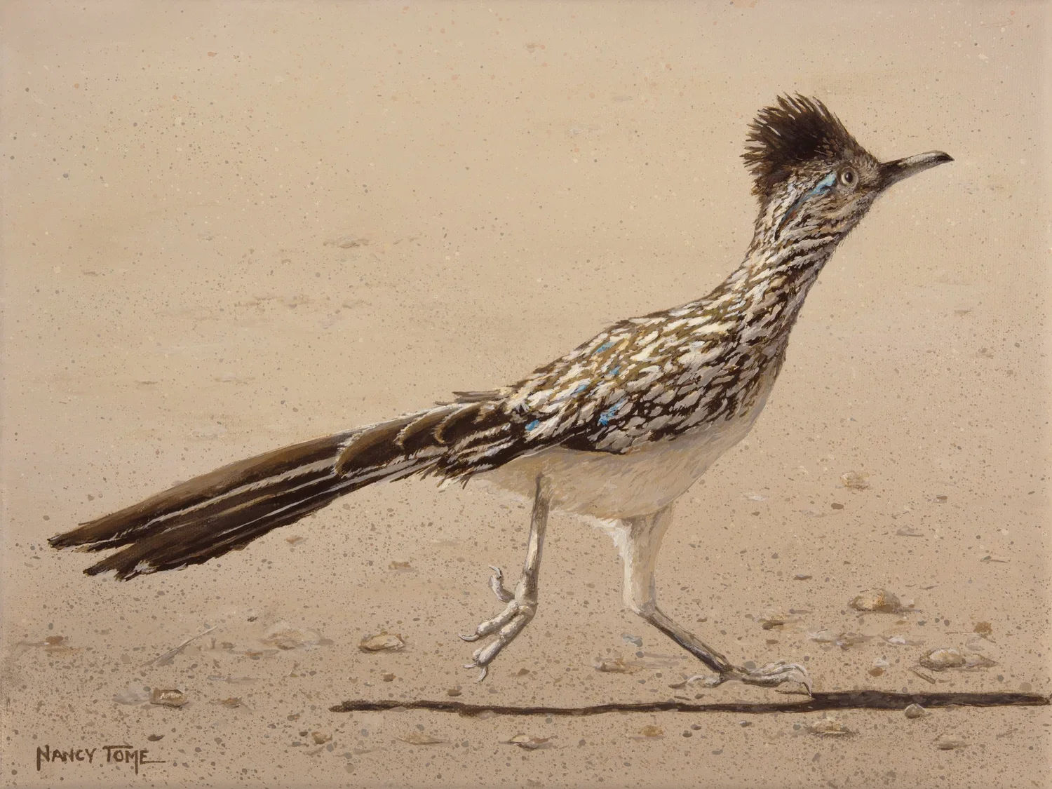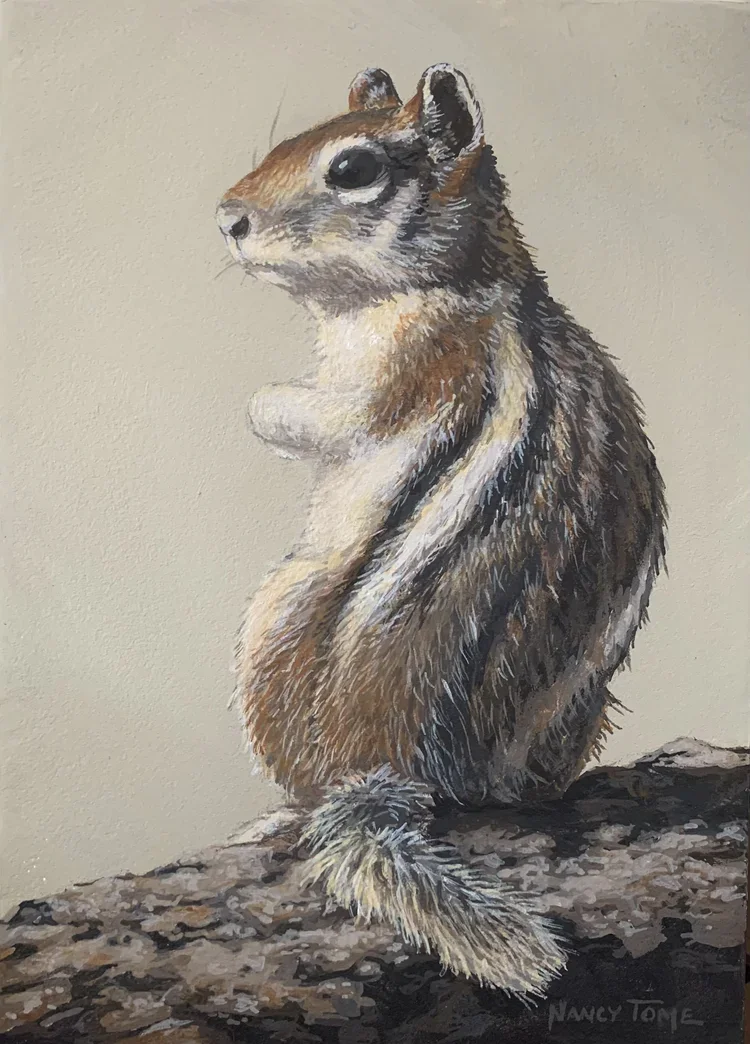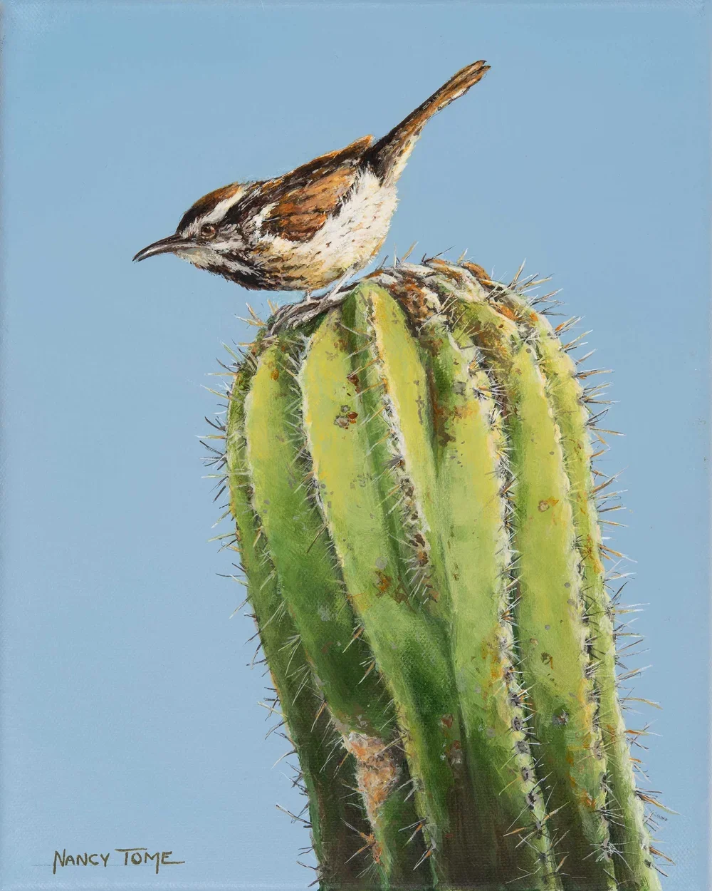Award winning, fine wildlife artist, Nancy Tome, depicts a variety of birds and other wildlife in everyday life. Combining distinct realism and composition in her paintings, Tome combines bold colors with intense detail to depict animals in their natural environment. Her acrylic paintings are designed to capture “a moment in time” of that animal’s daily life. She uses research obtained from travel, zoos and private collections to compile all of her knowledge and understanding of an animal and its environment into a realistic and emotional scene.