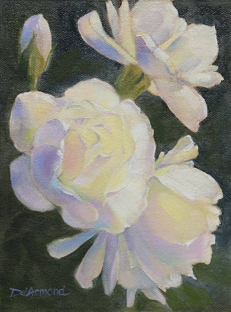 Susan De’Armond turned her passion for art into a serious pursuit of a fine art career in 2007. Plein air painting takes her back to memories of trekking through the woods on family outings, or memories of her grandmother tending her garden filled with her irises and lilacs. When De’Armond gets out into the woods or the wild, she says it feels like coming home.